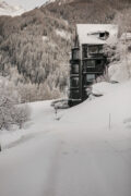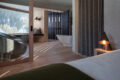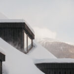 The dark structure nestles up against the 100-year- old main building, and in the cosy bay windows of the rooms and suites, guests can sit wrapped in blankets, face to face with the mountains.